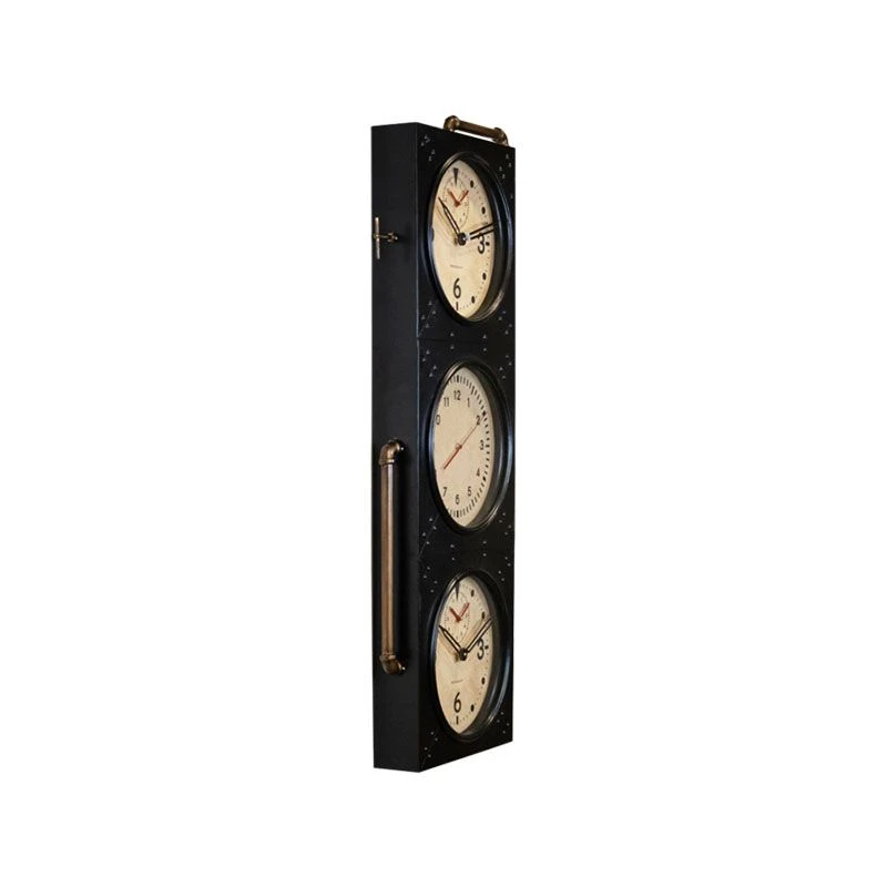 Making an impressive statement on the boardroom or office wall, our Air Station Wall Clock accurately presents the time in up to four different zones while a large dial in the middle shows the seconds sweeping by smoothly. Riveted steel case is surmounted by iron conduit for a truly industrial feel. A distressed painted finish conveys the sense of a well-used timepiece.