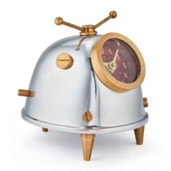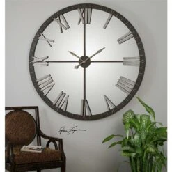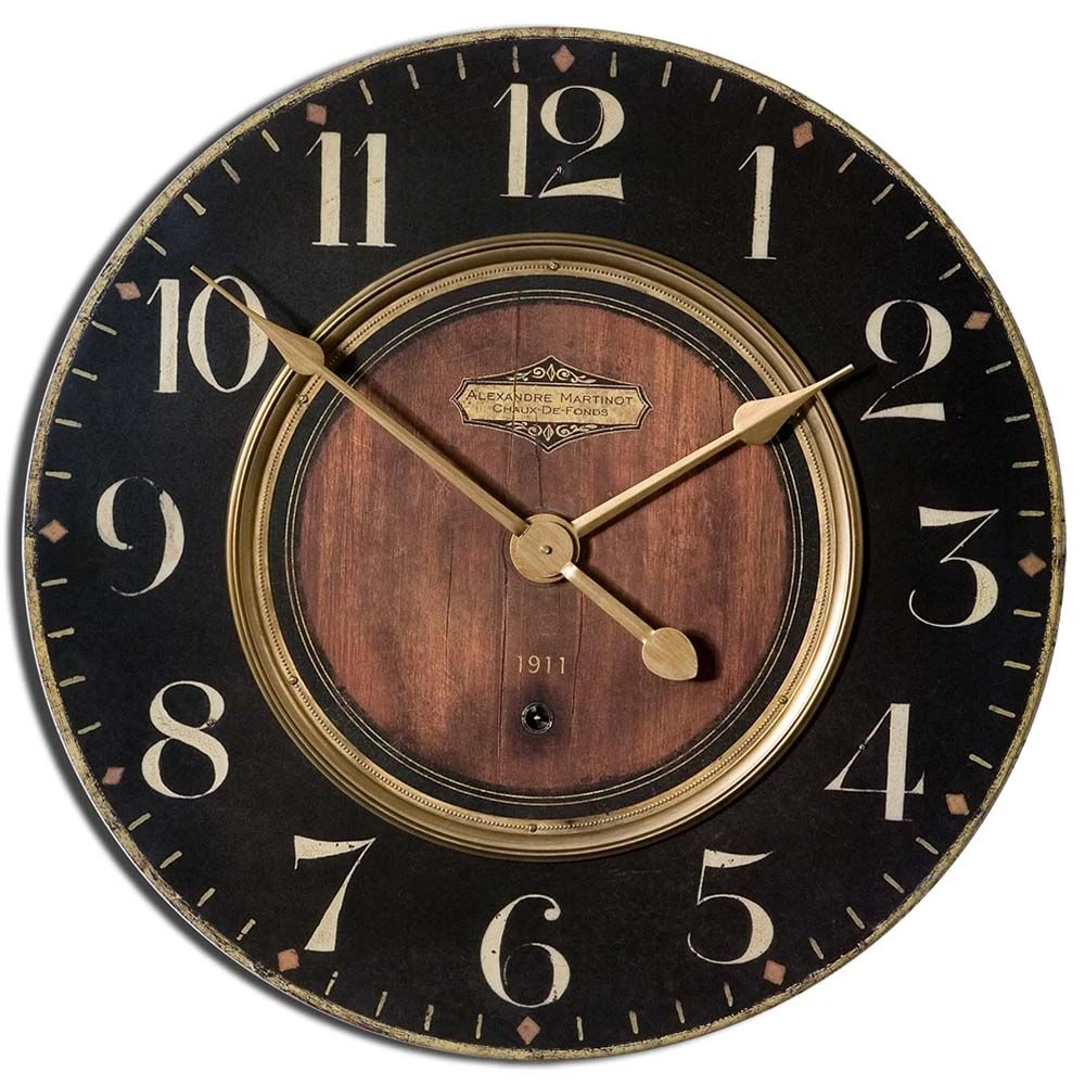 Weathered laminated clock face with cast brass details. Requires 1-AA battery.