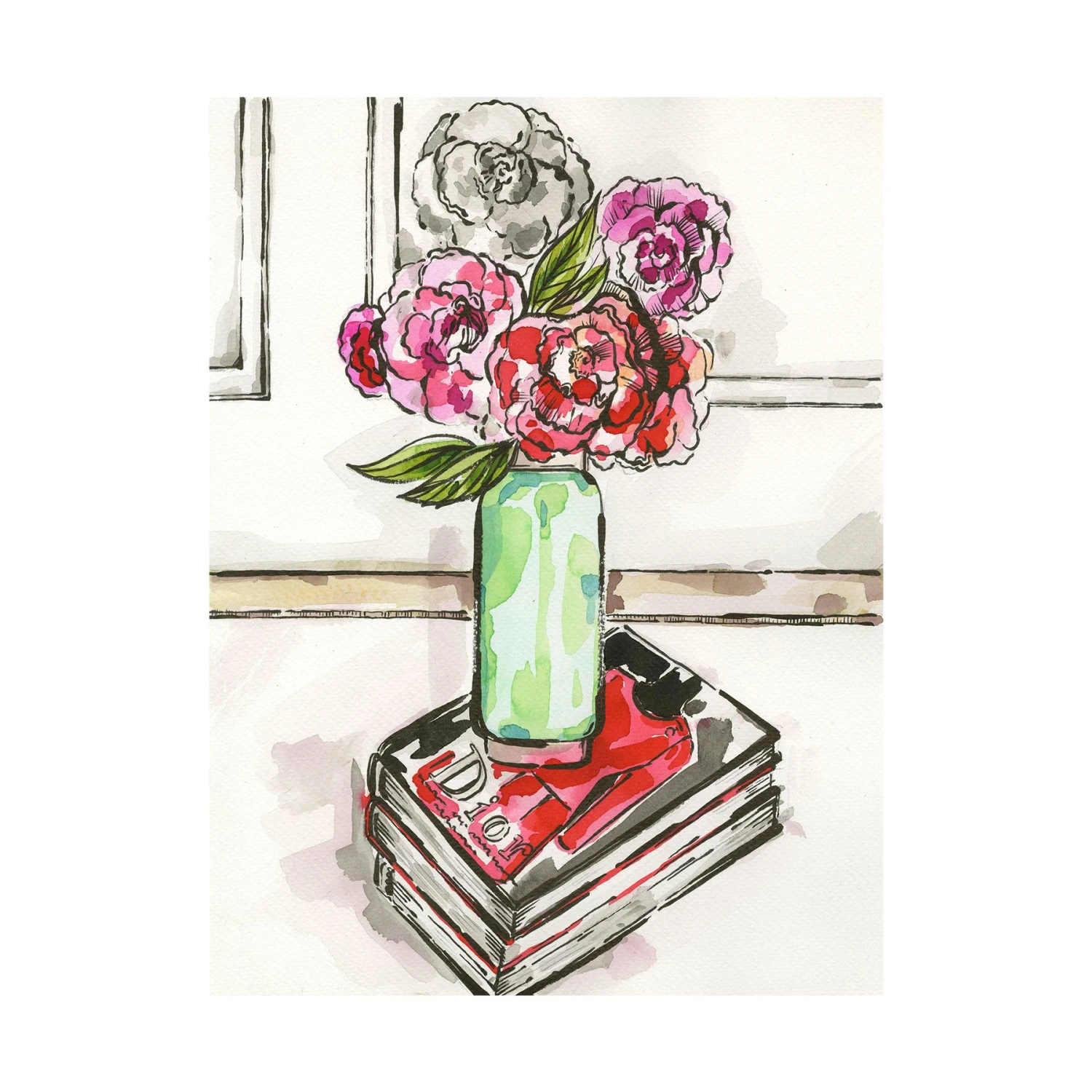 Enjoy the splendor of blooming peonies at home with this joyful, hand-painted, floral still life! This original watercolor is painted by artist and designer Ivy Kirk in Brooklyn, New York.