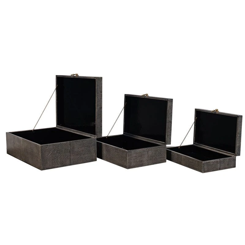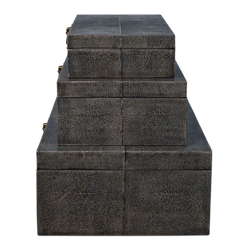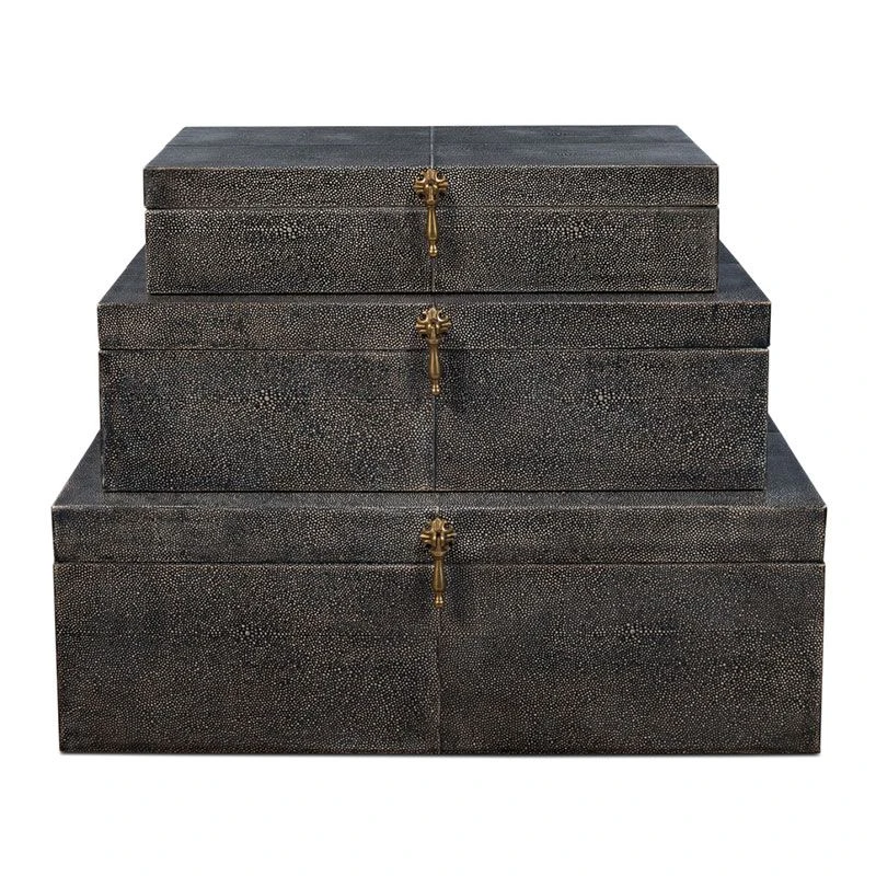 The Cosmos Nesting Boxes from Sarreid Ltd are finished in black shagreen. With brass handles. Set of 3.