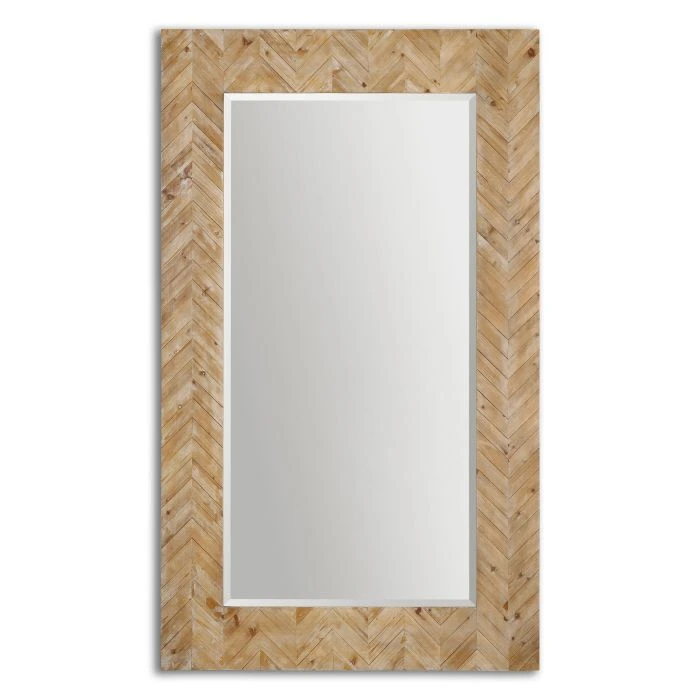 This stately mirror features a chevron patterned, solid wood frame finished with a light gray glaze. Mirror has a generous 1 1/4″ bevel. May be hung horizontal or vertical.