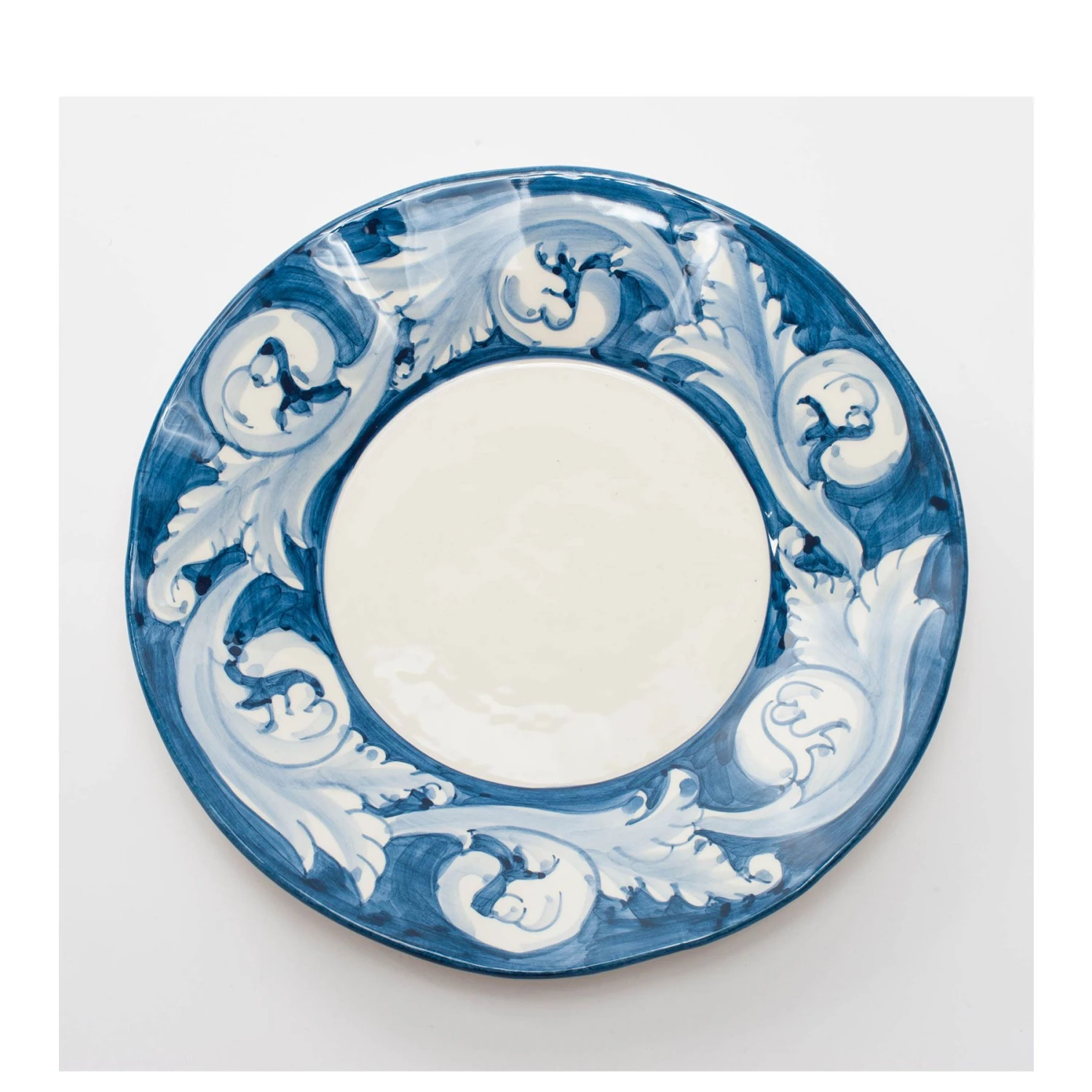 A beautiful hand painted and hand pressed ceramic dinner plate with a design in shades of blue. This hand made new line of Elena dinnerware is the best Portugal has to offer. The lovely acanthus design is nicely defined. Dishwasher and microwave safe.