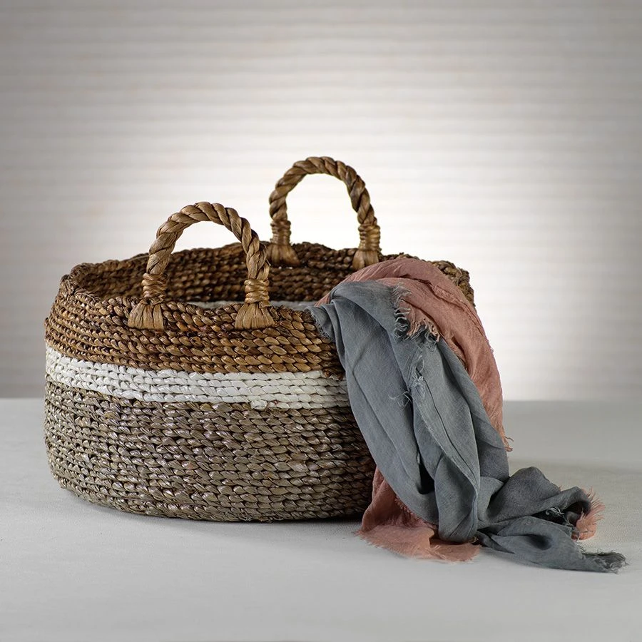 Wide bucket shaped and loop handled, our large seagrass and water hyacinth tote charms with a chic striped pattern in brown, white and silver. Sturdy yet flexible construction makes it endlessly versatile, perfect for collecting both clutter and compliments.