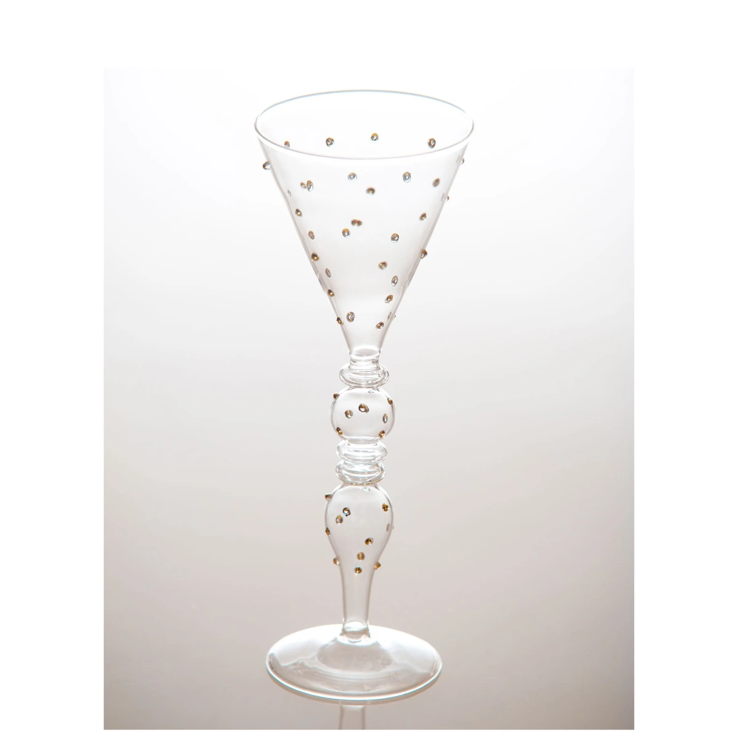 Wine served in these attractive Gatsby glasses are a way to make your evening glamorous and exciting. Tiny glass dots have been hand applied and painted gold. Hand wash to protect the gold leafing.