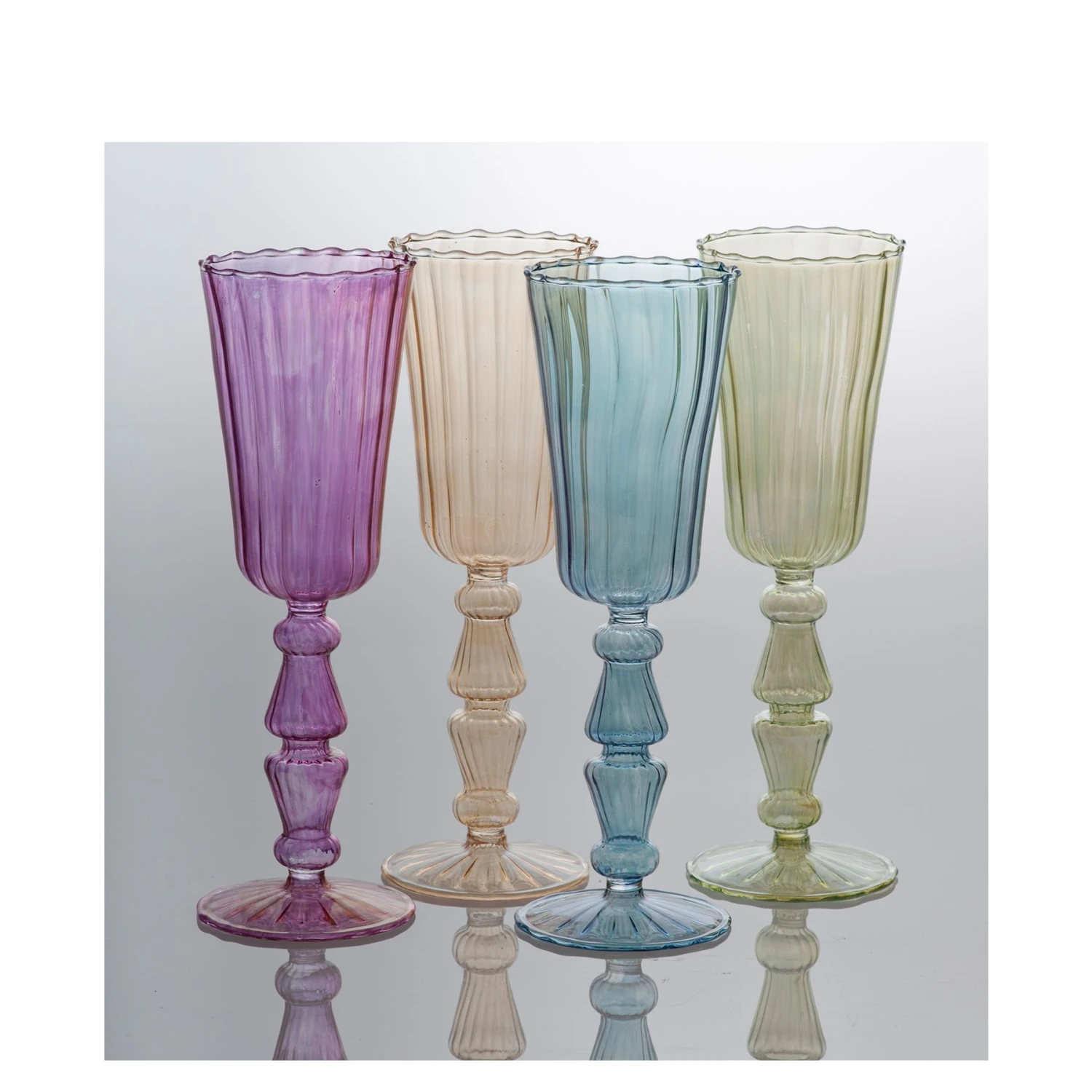 A set of four glasses in appealing pastel colors that may be used for many purposes. Enjoy a favorite wine or use as a spot of color on a dining table for a water glass. All handmade.