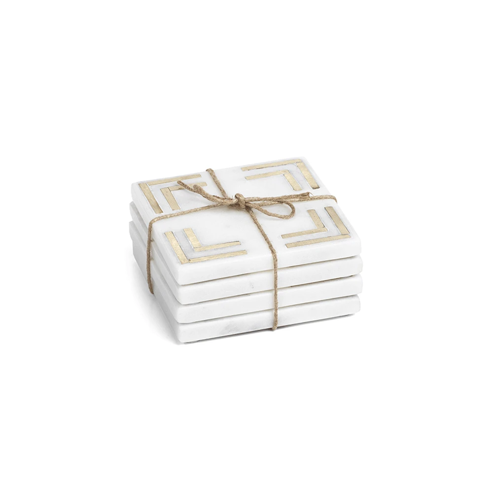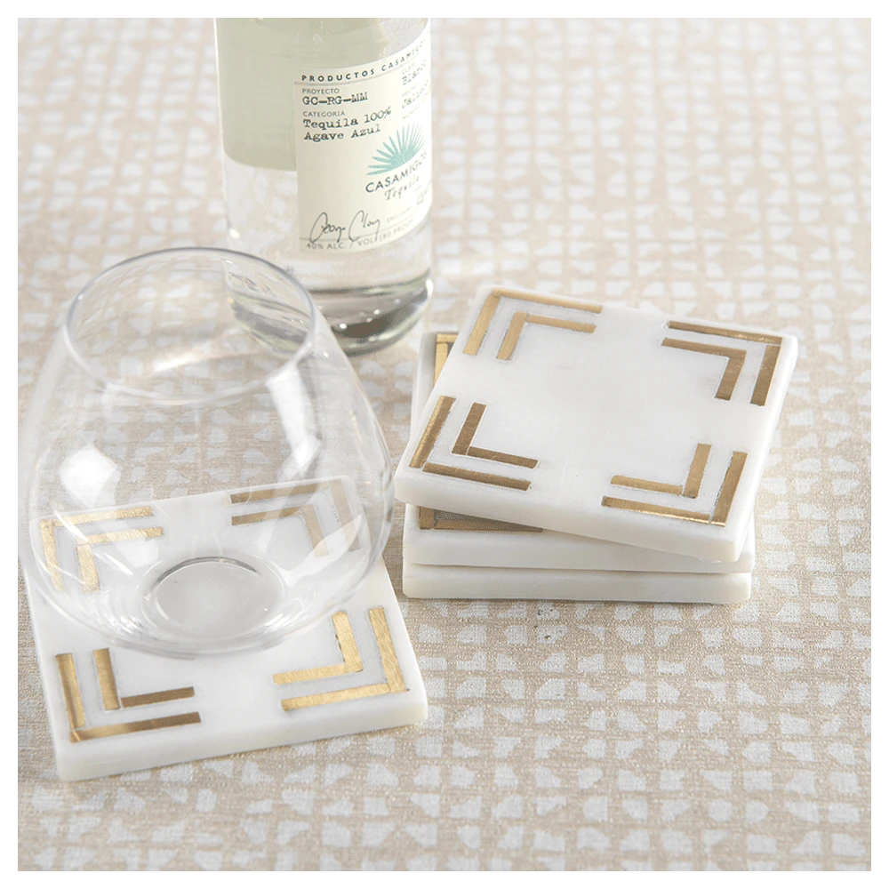 Protect your tabletops and table linens with these stylish marble coasters. These natural, white marble coasters with gold corner accents. Exuding casual elegance, these coasters offer refined beauty to your space.