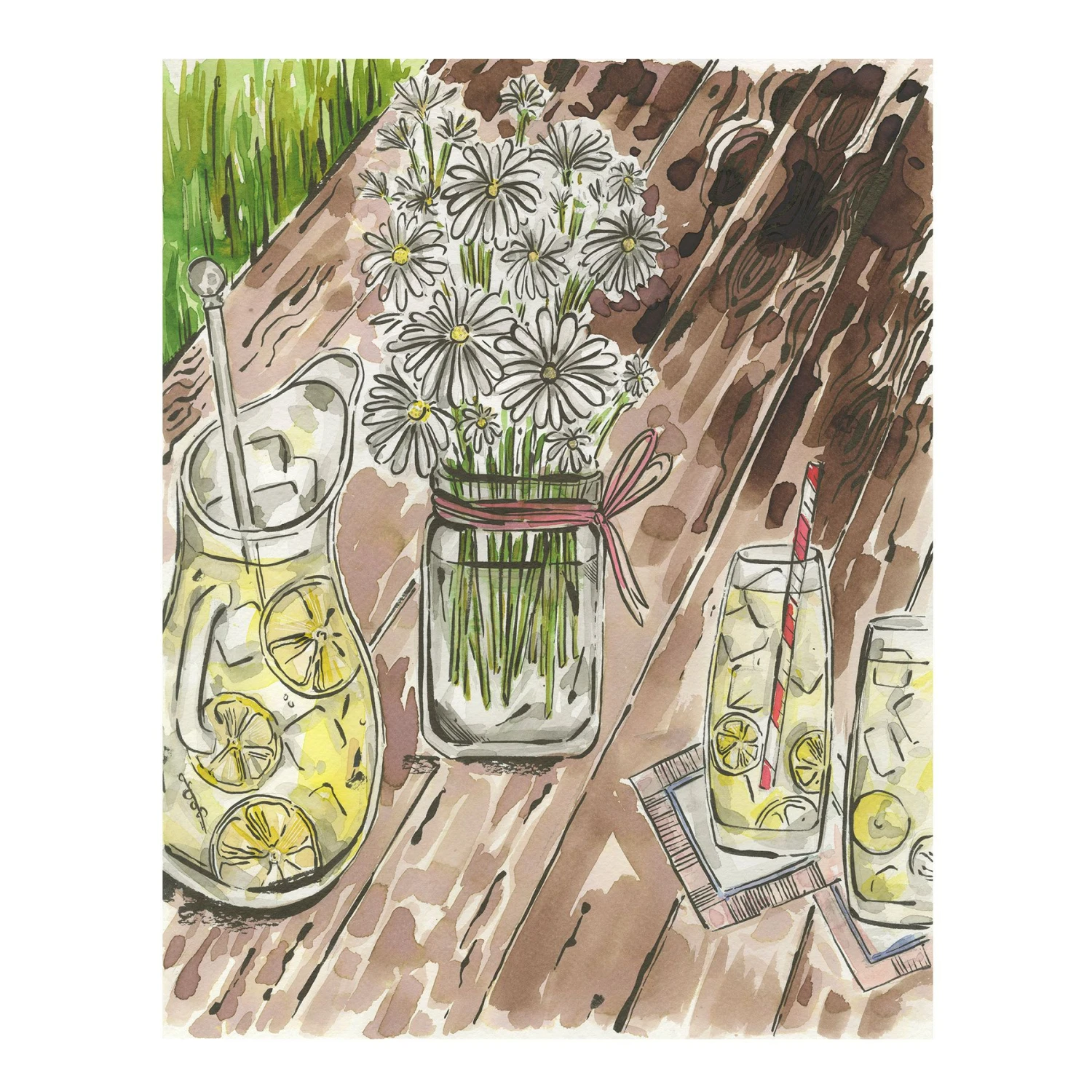 Bring a piece of the Hamptons home with a charming hand painted still life of Montauk daisies and lemonade! This original watercolor is painted by artist and designer Ivy Kirk in Brooklyn, New York.