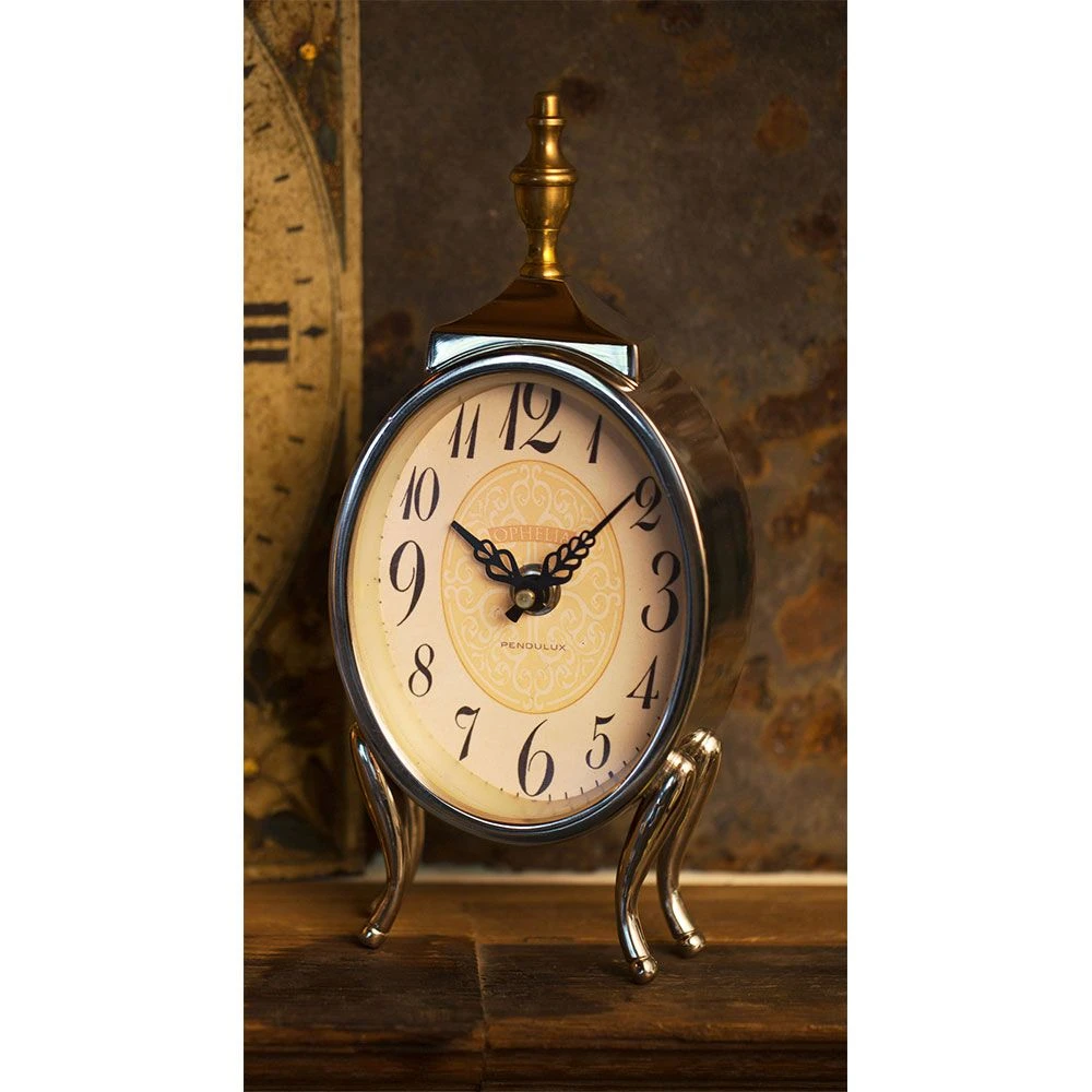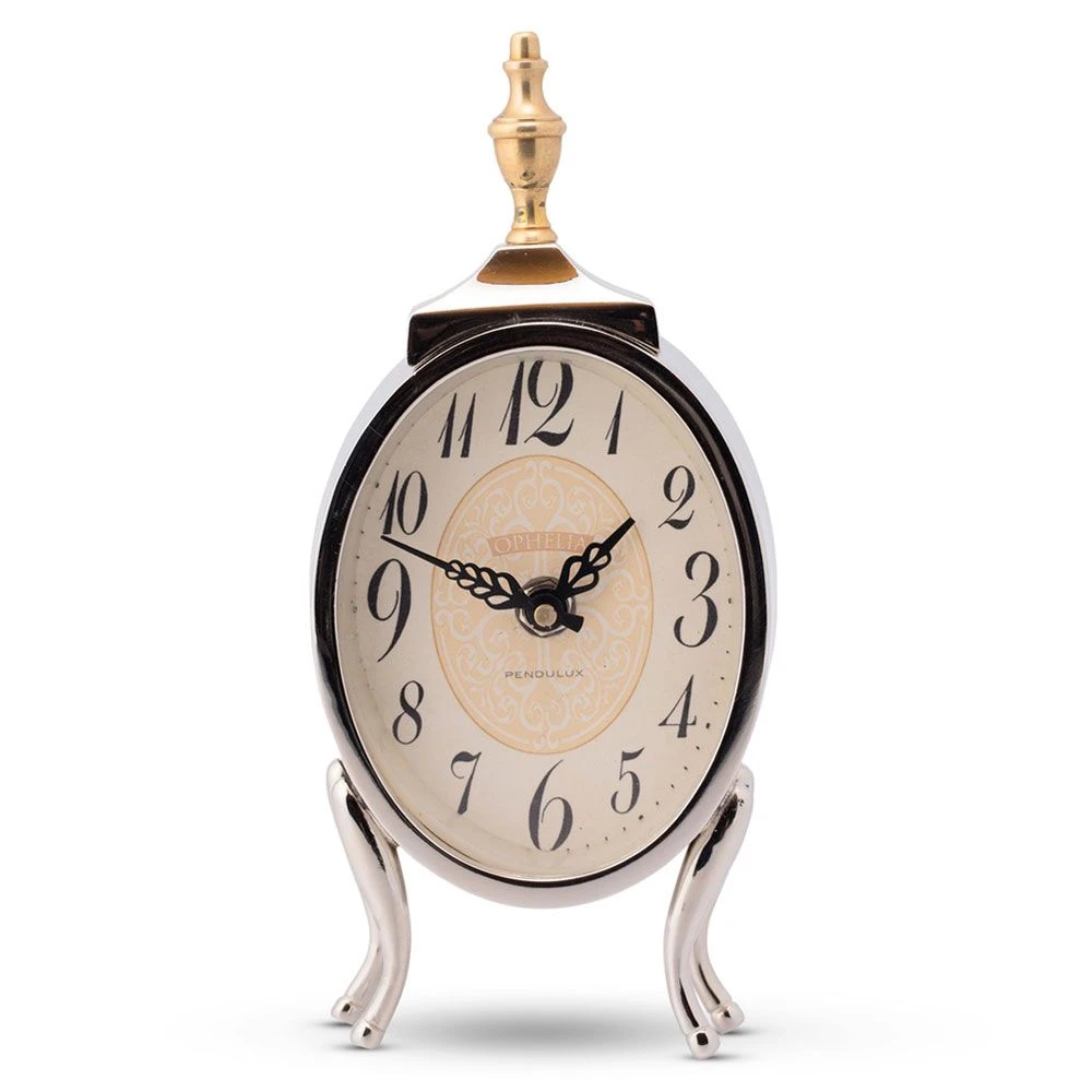The Ophelia Table Clock in nickel and brass stands 9 inches high. An elegant edition to any mantel, this clock radiates with its long frame and pure white dial standing bowed on graceful, curved legs. A copy of a vintage French mantel clock, the Ophelia Table Clock features a brass finial atop its solid nickel plate body.