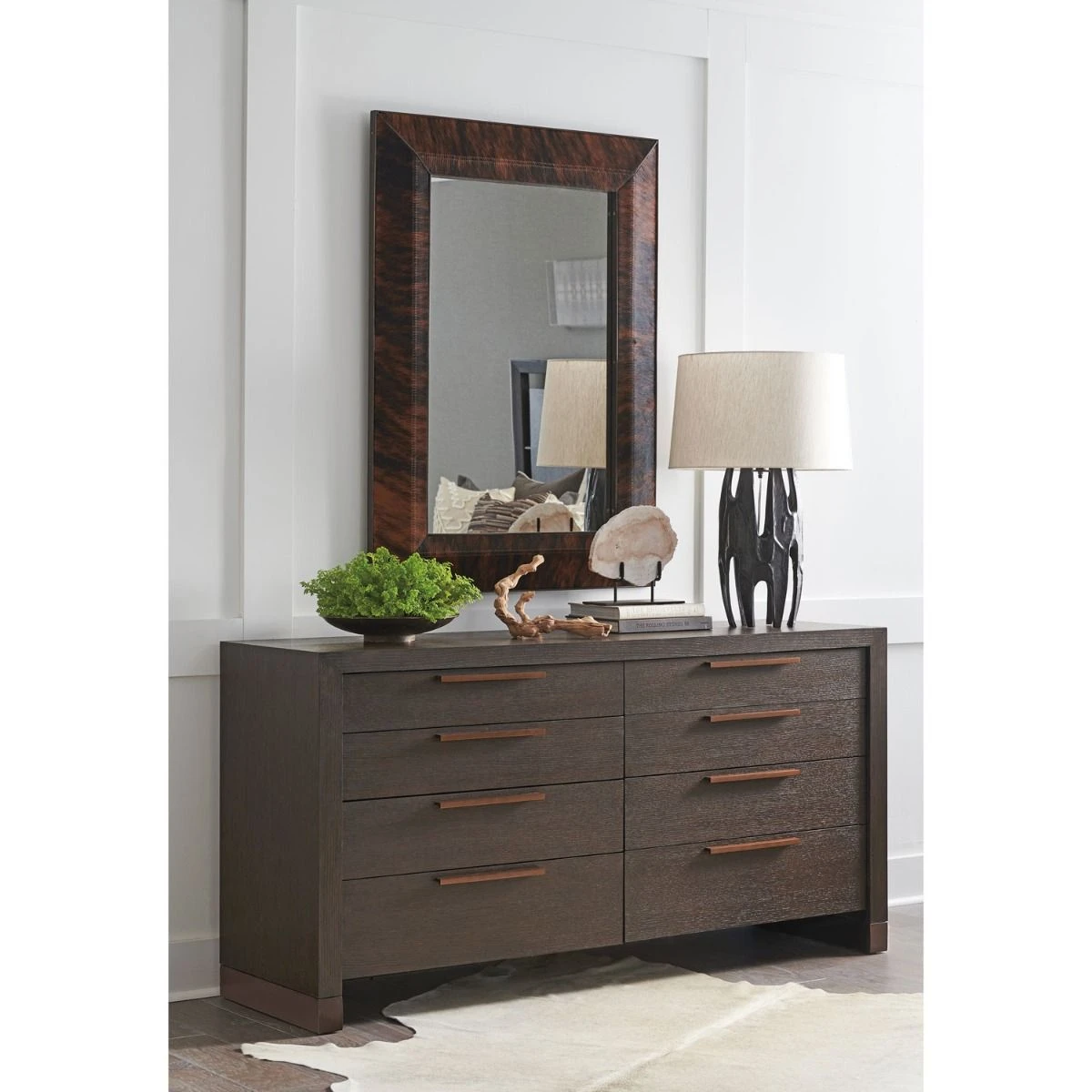 Highlighted by the elegant grain patterns of quartered white oak, designs in Park City boast clean architectural lines in a rich dark mocha finish. Custom hardware and metal accents framing the bases on many items are finished in burnished bronze. Signature items incorporate faux horn, authentic hair-on-hide leather, Alpine marble tops and ultra-clear glass. Upholstery silhouettes reinforce the modern look with clean lines and meticulous tailoring using supple leather, textural fabrics, and neutral palettes. The interpretation offers a warm, elegant, and inviting look that defines luxury mountain living.