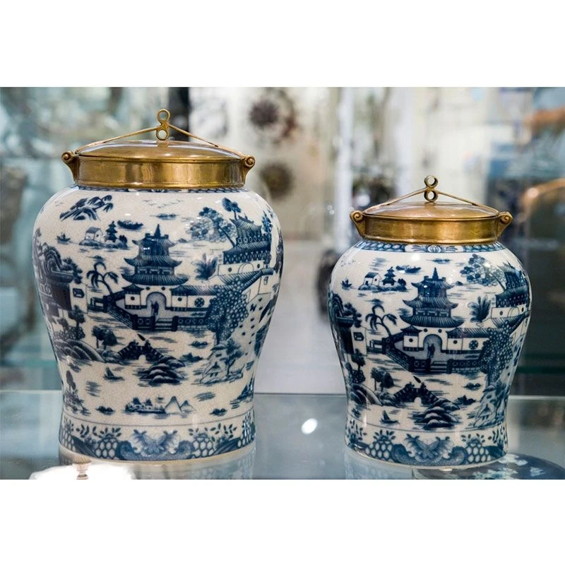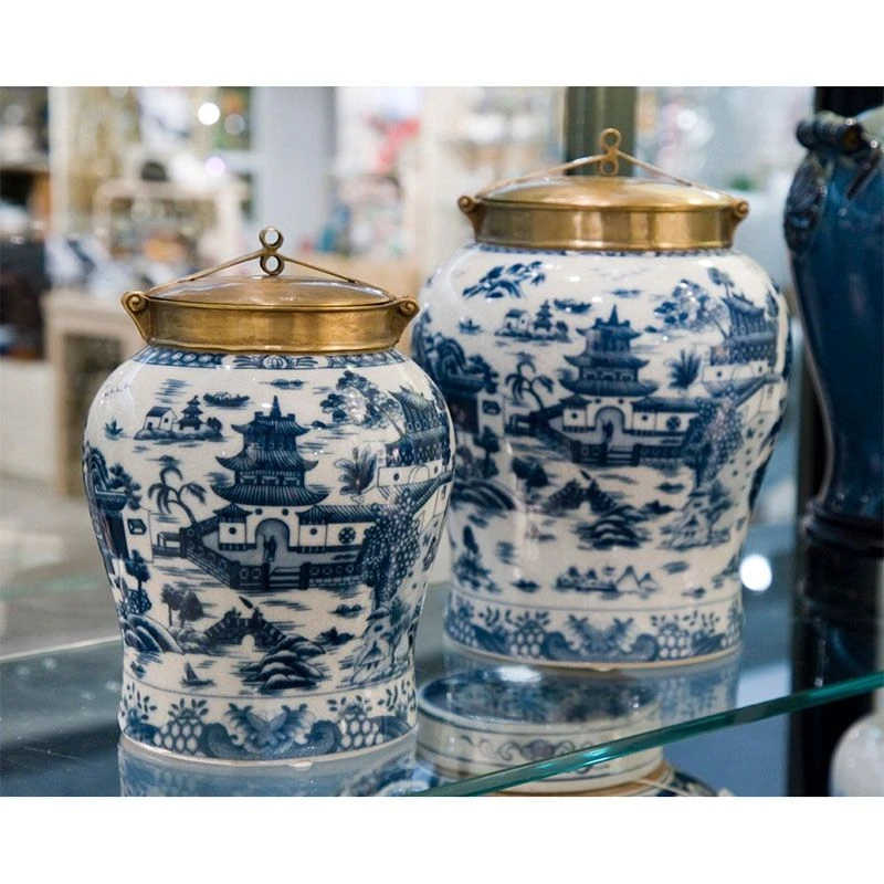 This classic porcelain jar is hand painted and features a traditional blue and white Chinoiserie design. Topped with a bronze lid.