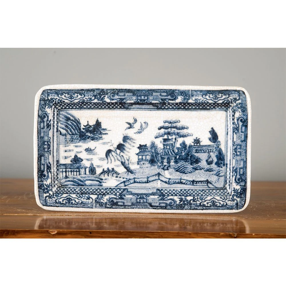 This classic porcelain rectangular tray features a traditional blue and white Chinoiserie motif. Sold in sets of 2.