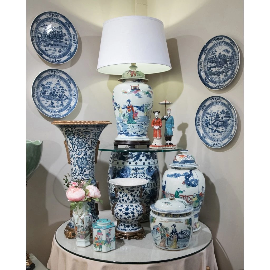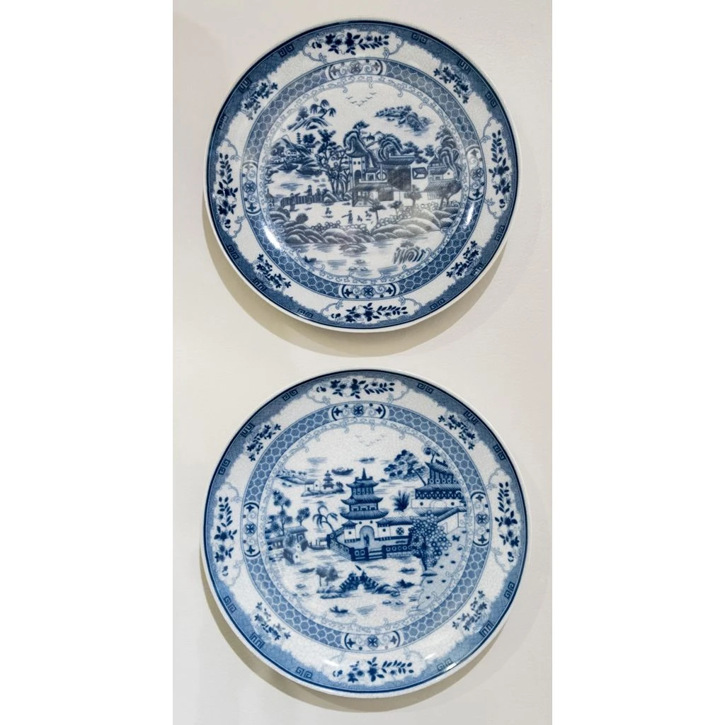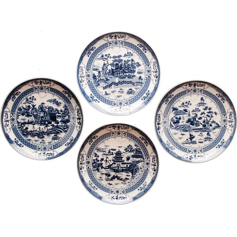 This set of 4 porcelain platters features different hand painted Chinoiserie styled designs.
