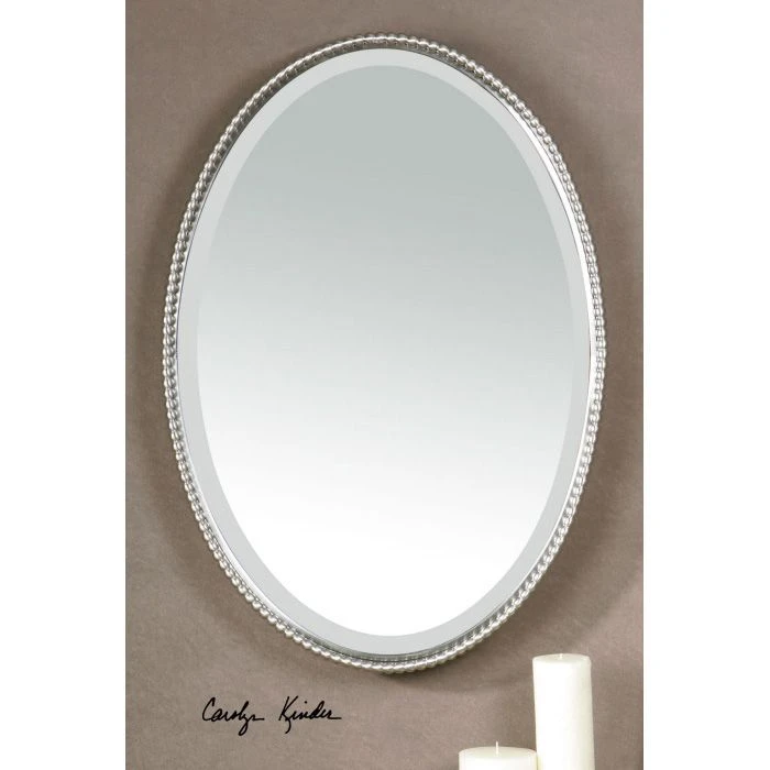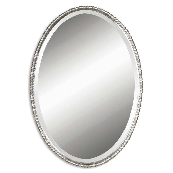 This oval mirror features a frame made of hand forged metal with a brushed nickel finish. Mirror is beveled. This mirror may be hung vertical or horizontal.