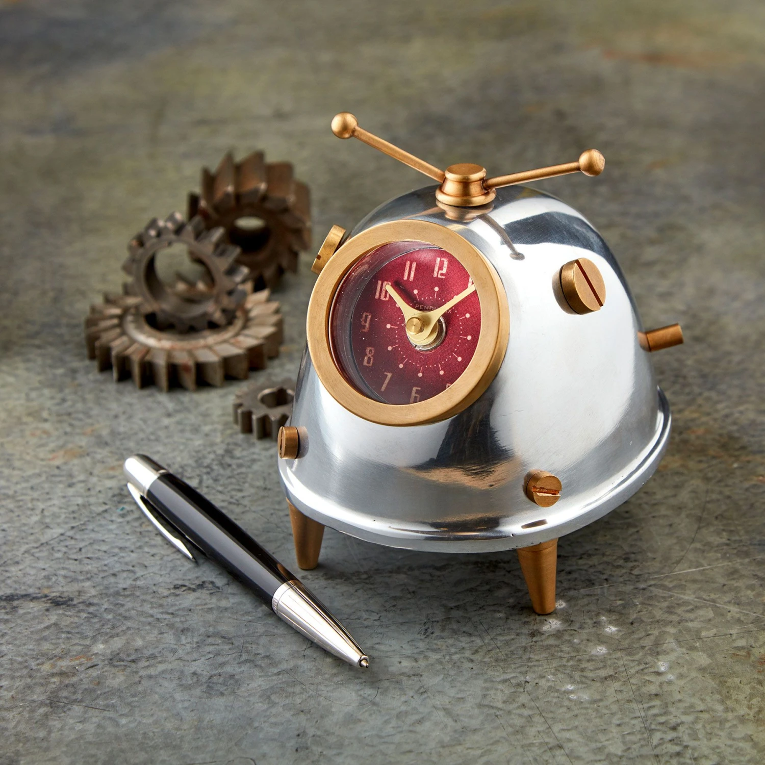 The cutest clock on any planet, our Space Bug table clock shows accurate earth time on a Mars-red dial, viewed through a solid brass porthole. Perched atop three conical brass feet, the polished cast aluminum body wards off gamma rays. A brass antenna seeks out new life and new civilizations.