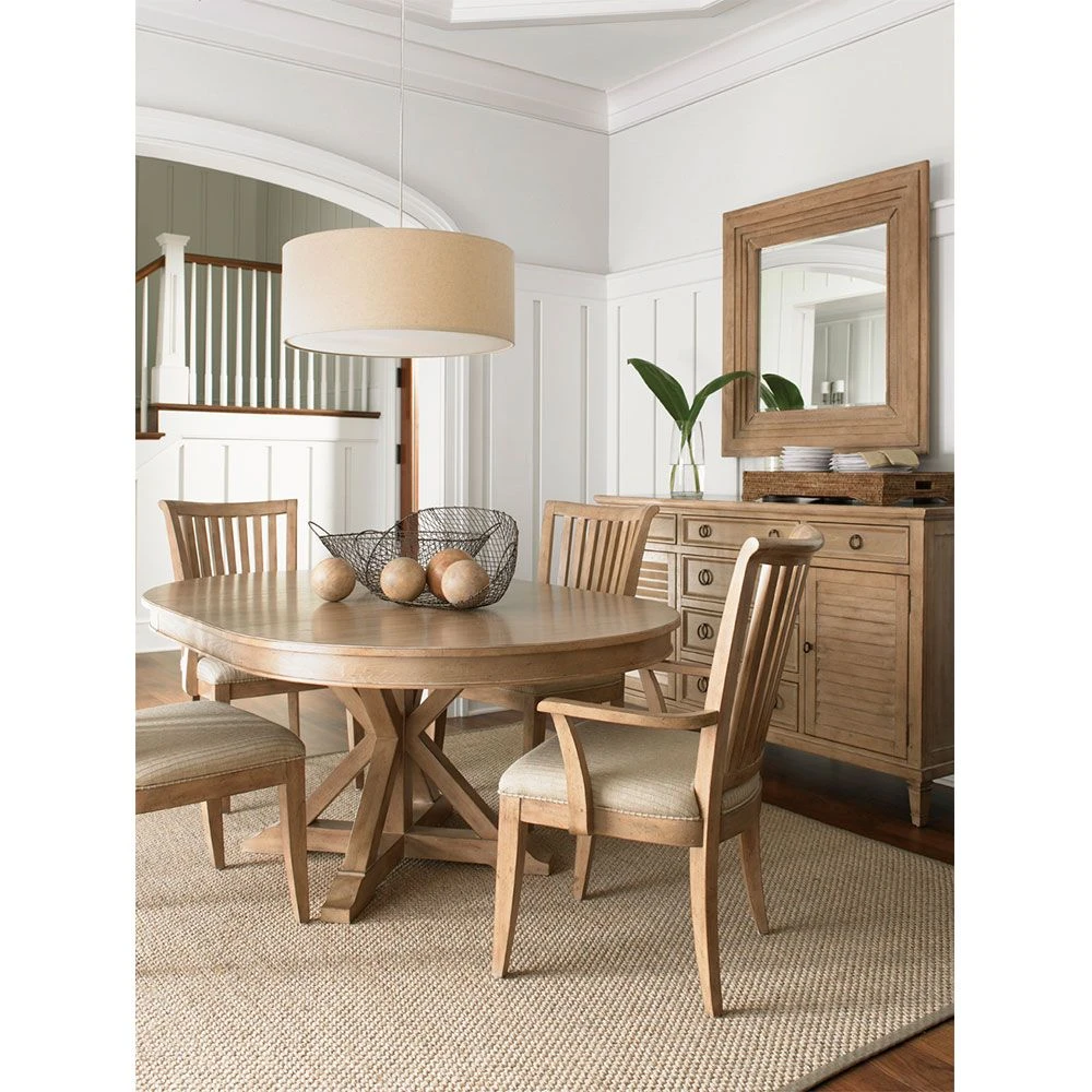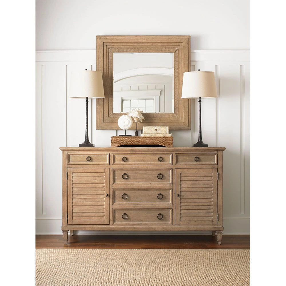 The Monterey Sands collection finds its inspiration in understated West Coast style. Crafted from Grey Elm veneer, pieces are gently wire-brushed to highlight the distinctive grain lines. The sandy brown Cambria finish is rubbed with an oyster white glaze, accentuating the character of the wood and offering a rich compliment to burnished bronze metal accents.