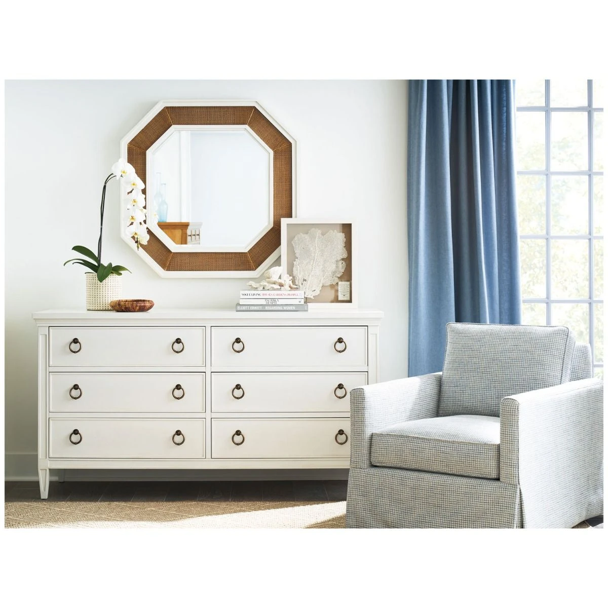 Designs in the Carmel collection are crafted from quartered white oak, finished in a crisp winterwhite coloration with rich camel undertones that highlight the distinctive grain lines. The inspiration came from the fresh, fashionable look of winter-white slacks and a camel hair blazer. Custom hardware and metal accents in burnished bronze Designs in the Carmel collection are crafted from quartered white oak, finished in a crisp winterwhite coloration with rich camel undertones that highlight the distinctive grain lines. The inspiration came from the fresh, fashionable look of winter-white slacks and a camel hair blazer. Custom hardware and metal accents in burnished bronze complement the artisan finish. White marble tops serve as a nod to classic design, while layered textile correlations showcase modern geometrics, abstracts, rich leather, and soft neutral textures.
