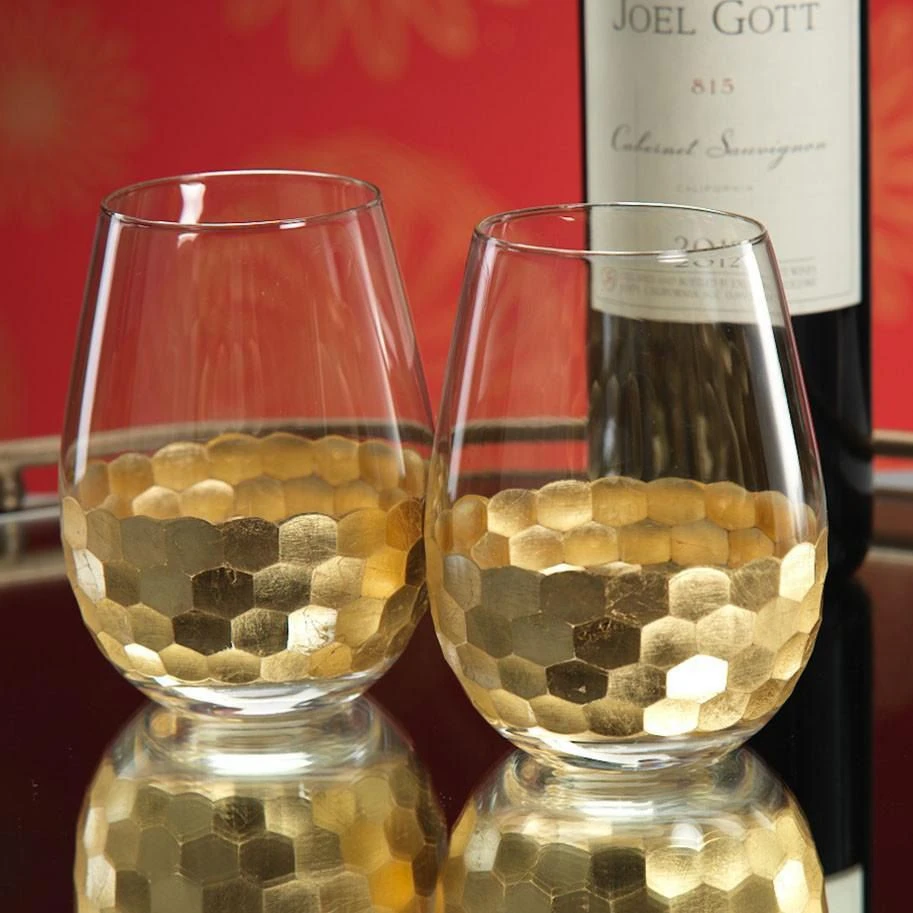 Update your glassware collection with this set of Vitorrio Wine Glasses. Decorated with gold tone honeycomb designs, these clear glasses are simple and chic.